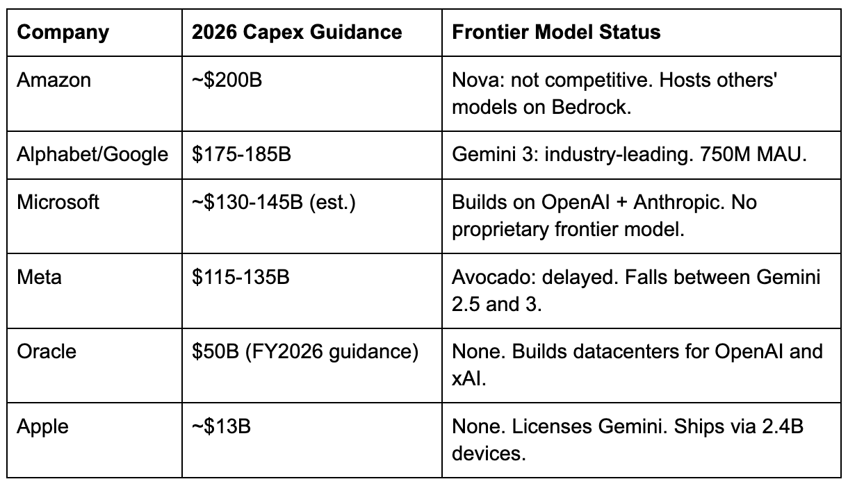 [71] Capex table sourcing. The non-correlation between spending and model capability is structural, not linear — Google’s capex produces the best models because of its research culture, not despite its spending level. Amazon: ~$200B, per CEO Andy Jassy, Q4 2025 earnings call, February 5, 2026 (company guidance). Alphabet/Google: $175-185B, per CFO Anat Ashkenazi, Q4 2025 earnings call, February 4, 2026 (company guidance). Microsoft: ~$130-145B estimated range; H1 FY2026 capex was $72.4B ($34.9B Q1 + $37.5B Q2), per Microsoft Q1 and Q2 FY2026 earnings releases. CFO Amy Hood guided Q3 capex to “decrease on a sequential basis,” implying H2 may be lower than H1. The range reflects annualized H1 at the full rate (~$145B ceiling) and a scenario in which H2 declines modestly (~$130B floor). Microsoft does not issue formal annual capex guidance. Meta: $115-135B including principal payments on finance leases, per Q4 2025 earnings release, January 28, 2026 (company guidance). Oracle: $50B FY2026 guidance, raised from $35B at Q1 FY2026 to $50B at Q2 FY2026 earnings call, December 10, 2025. Confirmed unchanged in Q3 FY2026 SEC filing (March 2026). Apple: FY2025 capex was $12.7B per 10-K filing; no formal FY2026 guidance issued. The figure represents the trailing actual. Table sorted by descending capex magnitude.