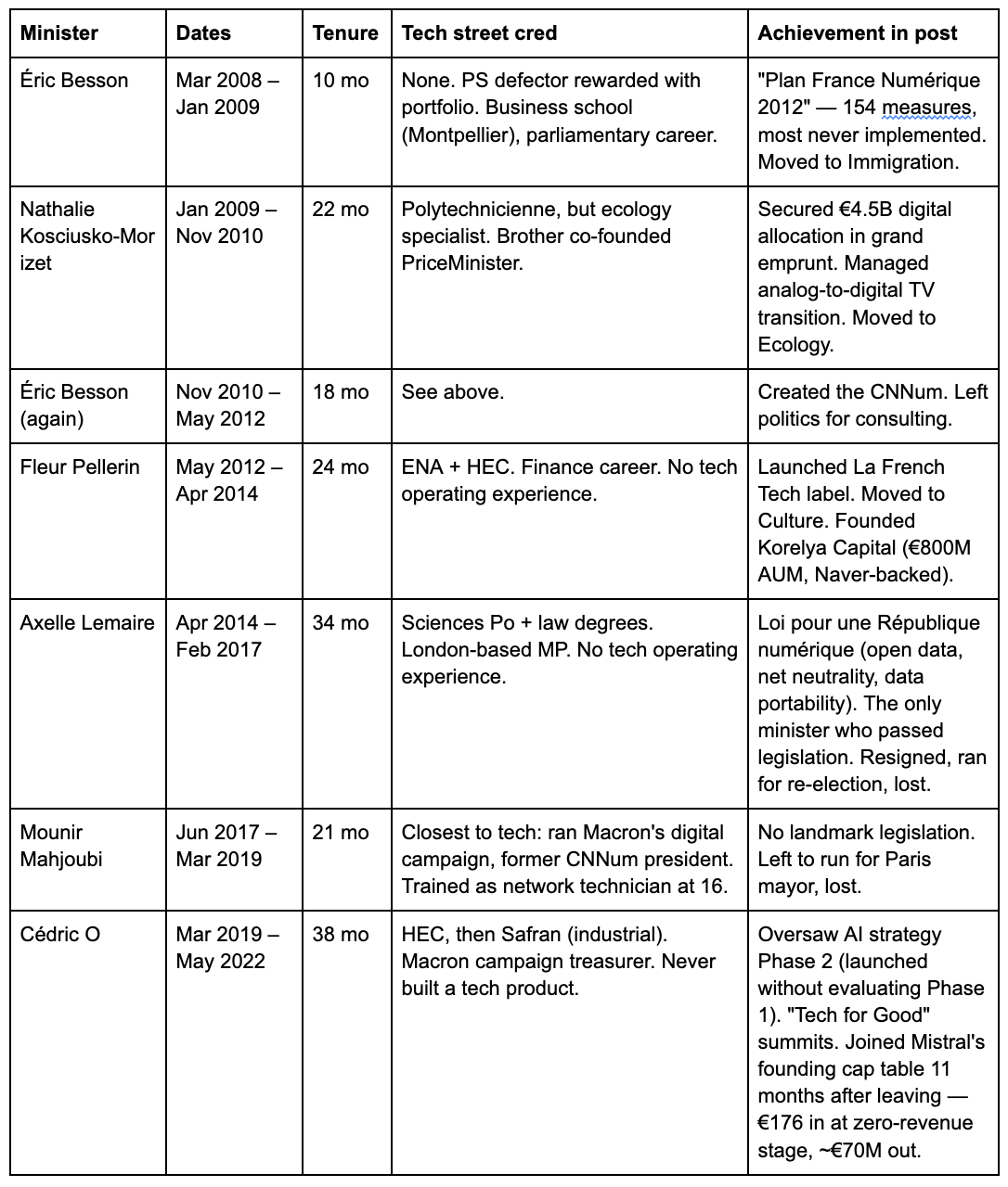 Four more followed — Barrot, Ferrari, Chappaz, Le Hénanff — none with tech operating experience, none lasting longer than twenty months, none passing legislation.[34]