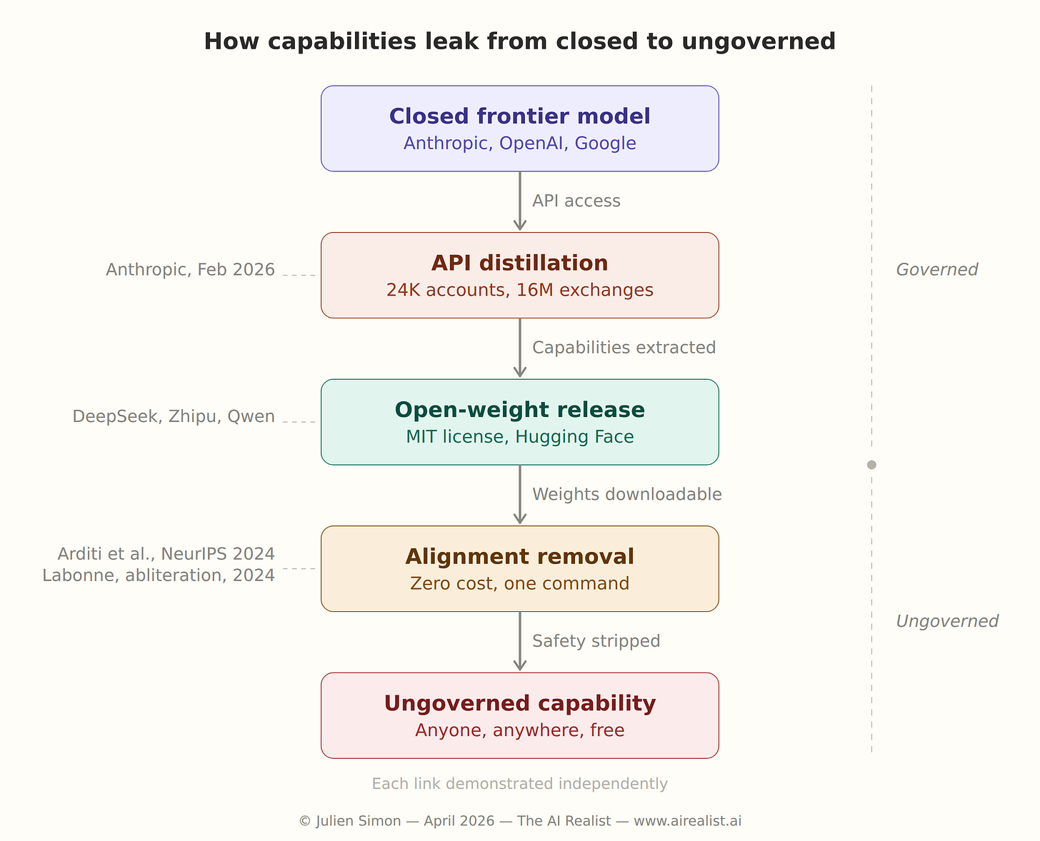 The distillation evidence also reveals the bridge between the two arms of the pincer. Capabilities developed inside a closed model leak through the API layer via distillation. Once distilled into an open-weight model and released — as DeepSeek R1 was, under a permissive open license, in January 2025 — the alignment removal techniques apply. The model that was too dangerous to release is now downloadable, uncensored, and free.