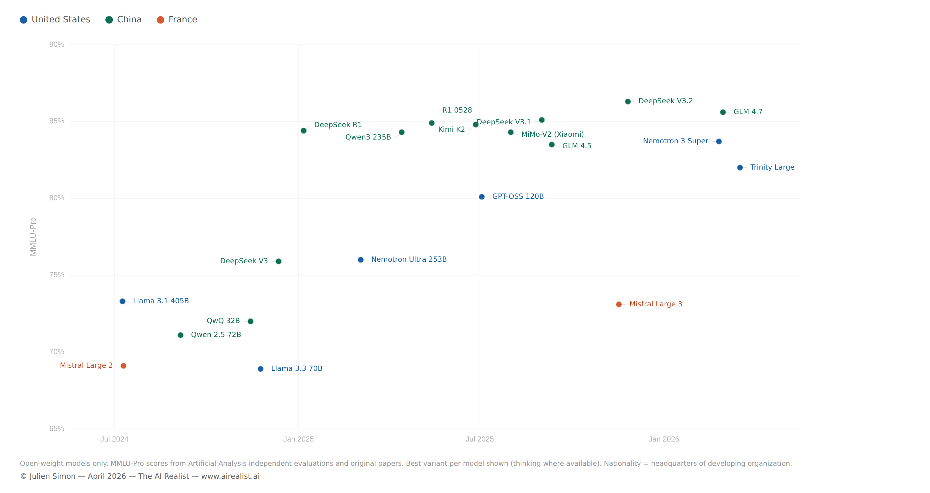[64] Mark McQuade, CEO of Arcee AI, quoted in TechCrunch: “Arcee exists because the U.S. needs a permanently open, Apache-licensed, frontier-grade alternative that can actually compete at today’s frontier.” CTO Lucas Atkins described Trinity-Large-Thinking as “on many axes, the strongest open model ever released outside of China.” Disclosure: the author was Chief Evangelist at Arcee AI until November 2025. All benchmarks and adoption figures cited in this piece are independently verifiable via OpenRouter and the sources linked above.