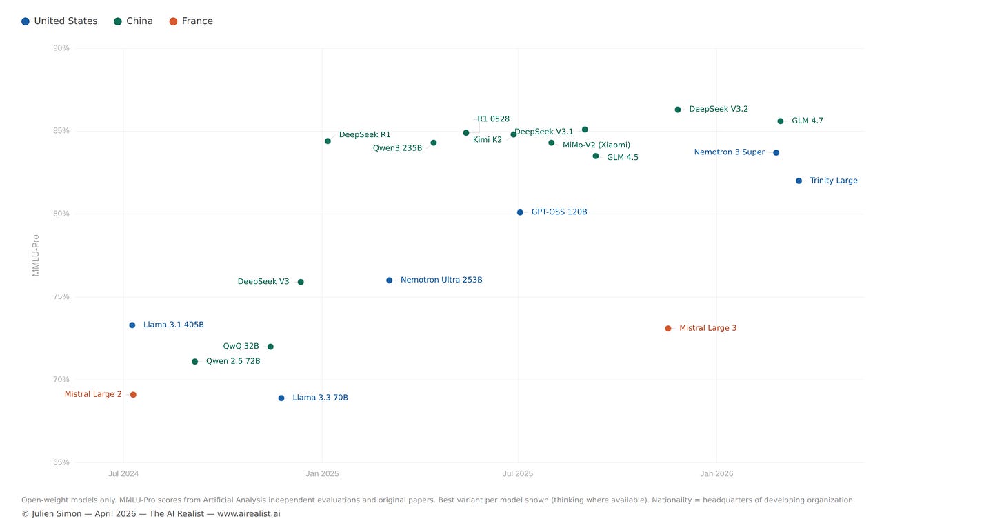 The responses are forming, though none yet constitute a trend. Arcee AI framed Trinity Large as “a permanently open, Apache-licensed, frontier-grade alternative” built in the U.S. — and its CTO described the reasoning model, released this week, as “the strongest open model ever released outside of China.”[64] One startup does not make an ecosystem — but the claim is no longer aspirational. OpenAI released GPT-OSS in the summer of 2025. Google released Gemma 4 under an Apache 2.0 license the day this piece was published, the first time the Gemma family has shipped with a fully permissive license (MMLU / MMLU Pro scores will be added when they’re available).