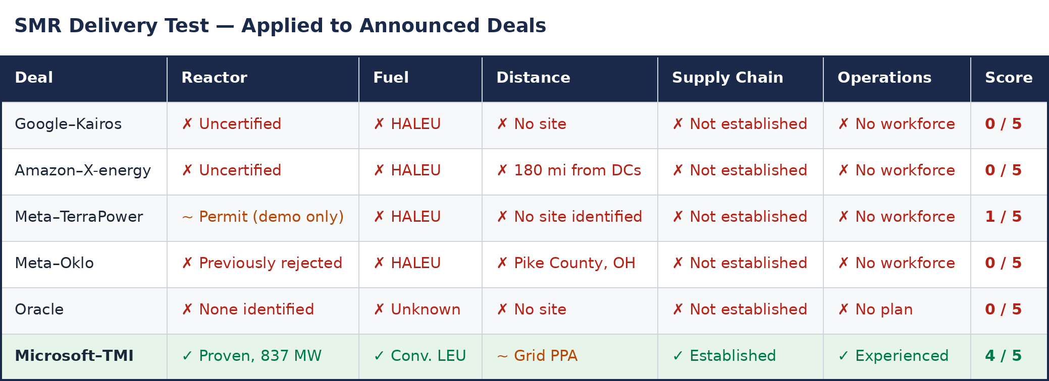 [61] The author’s assessment applies the five-question SMR Delivery Test to each announced deal. The test evaluates delivery readiness, not economics; cost analysis is developed separately in the “What it costs” section. A sixth question — “What does the power cost per megawatt-hour, and how does that compare to alternatives?” — is analytically essential but excluded from the delivery test because no SMR deal has progressed far enough to produce a binding price. Oracle’s announcement fails all five: no reactor identified (fails Q1), no fuel determined (fails Q2), no site identified (fails Q3), no supply chain mapped (fails Q4), no operational plan disclosed (fails Q5).