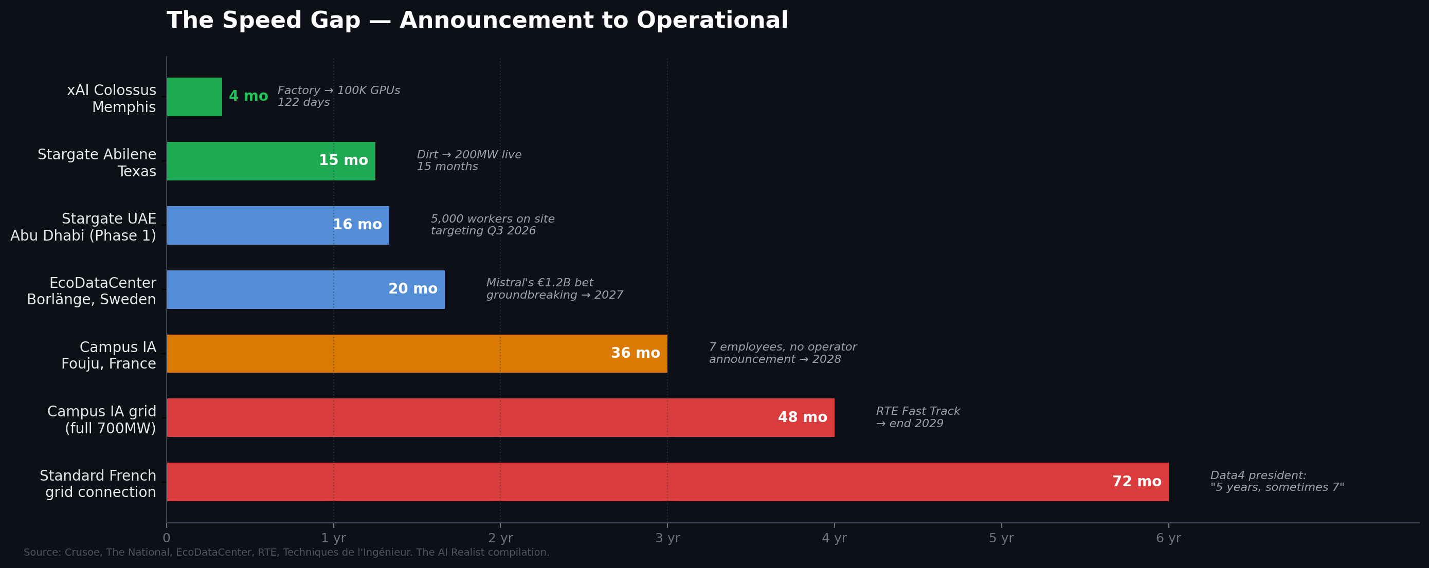 [35] International construction speed comparison. Stargate Abilene: first two buildings (200+ MW, 980,000 sq ft) operational September 30, 2025, roughly 15 months after construction began in June 2024 (Crusoe press release; DCD; CNBC). Stargate UAE: 5,000+ workers on site, Phase 1 (200MW) targeting Q3 2026, ~15 months from announcement (The National, December 2025; DCD). EcoDataCenter Borlänge (Mistral’s Sweden site): land purchased September 2024, broke ground September 24, 2025, Phase 1 targeting early-to-mid 2027 (EcoDataCenter press release; DCNN Magazine; BeBeez). Data4 president Olivier Micheli on French grid connection delays: risen to “more than five years and sometimes seven” (Techniques de l’Ingénieur, 2025). Crusoe Abilene announcement | Stargate UAE (The National) | EcoDataCenter Borlänge groundbreaking (DCNN)