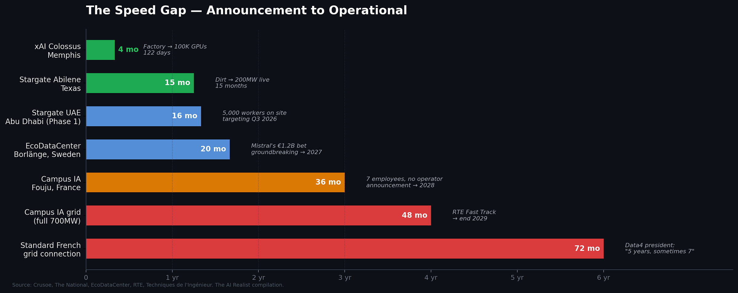That is what it takes. Land acquisition, brownfield remediation, environmental assessment, power purchase agreements with nuclear and renewable providers, grid connection contracts with a national transmission operator, local political negotiation across multiple communes and départements, multi-billion-euro debt structures with institutional investors, and building permits that require public inquiries before a single foundation is poured. Data4 has been operating French datacenters for years. It started acquiring AI-relevant sites in 2023. And as of March 2026, no new AI-dedicated facility is operational. Building permits are pending at Cambrai and Nozay. This is not failure: it is the responsible pace of infrastructure at this scale. The problem is that the summit treated a multi-year industrial process as though it could be summoned with a press release. And while France navigates this process, competing jurisdictions are building at a different speed entirely. Stargate’s Abilene campus in Texas went from dirt to live servers in fifteen months. MGX’s own Stargate UAE has 5,000 construction workers on site building Phase 1 for a Q3 2026 delivery — the same MGX that has seven employees on farmland in Fouju. Mistral voted with its capital: its first infrastructure investment outside France was €1.2 billion in Sweden, where hydropower and faster permitting compress timelines that France cannot match.[35]