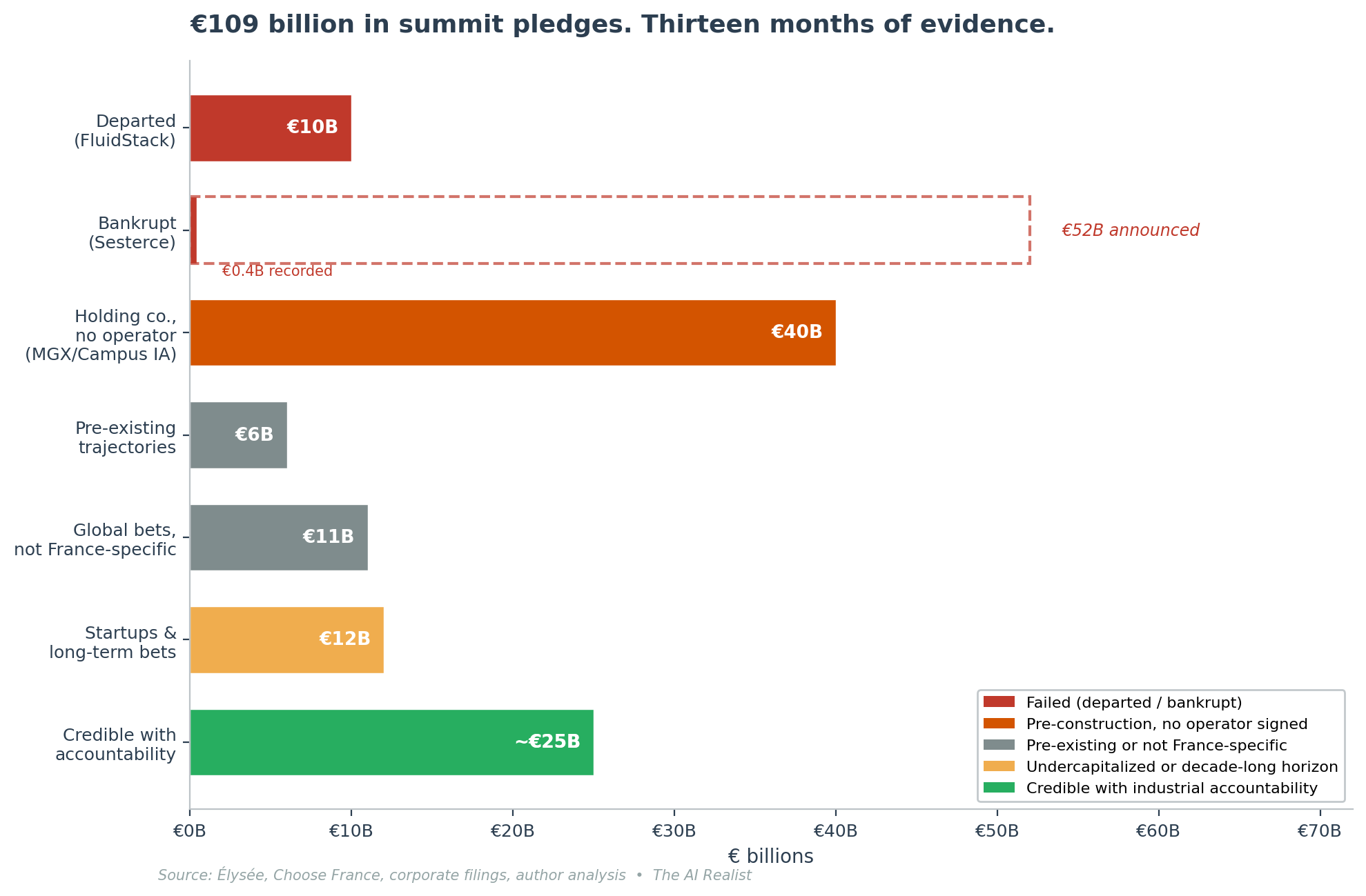 The policy reforms did not require giving stage time to Sesterce, and the structural failures of the three largest pledges are not timeline problems: they are accountability problems. FluidStack did not leave because 13 months was too short. Sesterce did not enter judicial restructuring because the construction hadn’t started yet. MGX has not failed to sign an operator because the timetable is ambitious. These are structural failures that no timeline extension will fix.