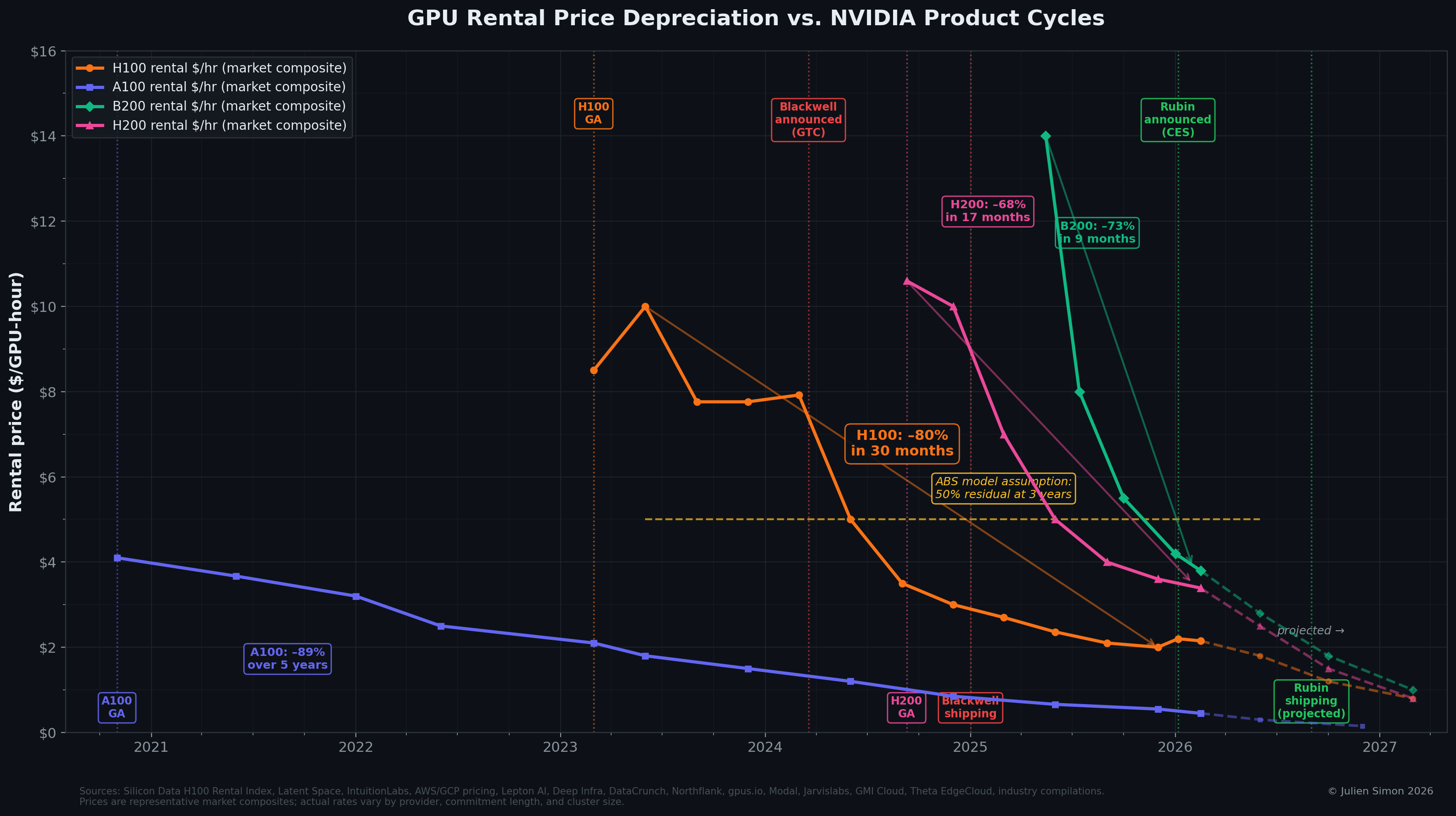 The pattern is clear. H100 rental prices fell 80% in 30 months — blowing through the ABS models’ 50%-at-three-years assumption roughly 18 months ahead of schedule. The H200 — a memory upgrade on the same Hopper architecture — fell 68% in just 17 months, from $10.60 at AWS’s September 2024 launch to a $3.39 median today. The A100 shows the longer arc: an 89% decline over five years, accelerating after its successor shipped. And the B200 — the current flagship — has fallen 73% in just 9 months, from $14 per hour at AWS’s May 2025 launch to specialist providers already offering it for below $3 per hour, with Rubin six months away.
