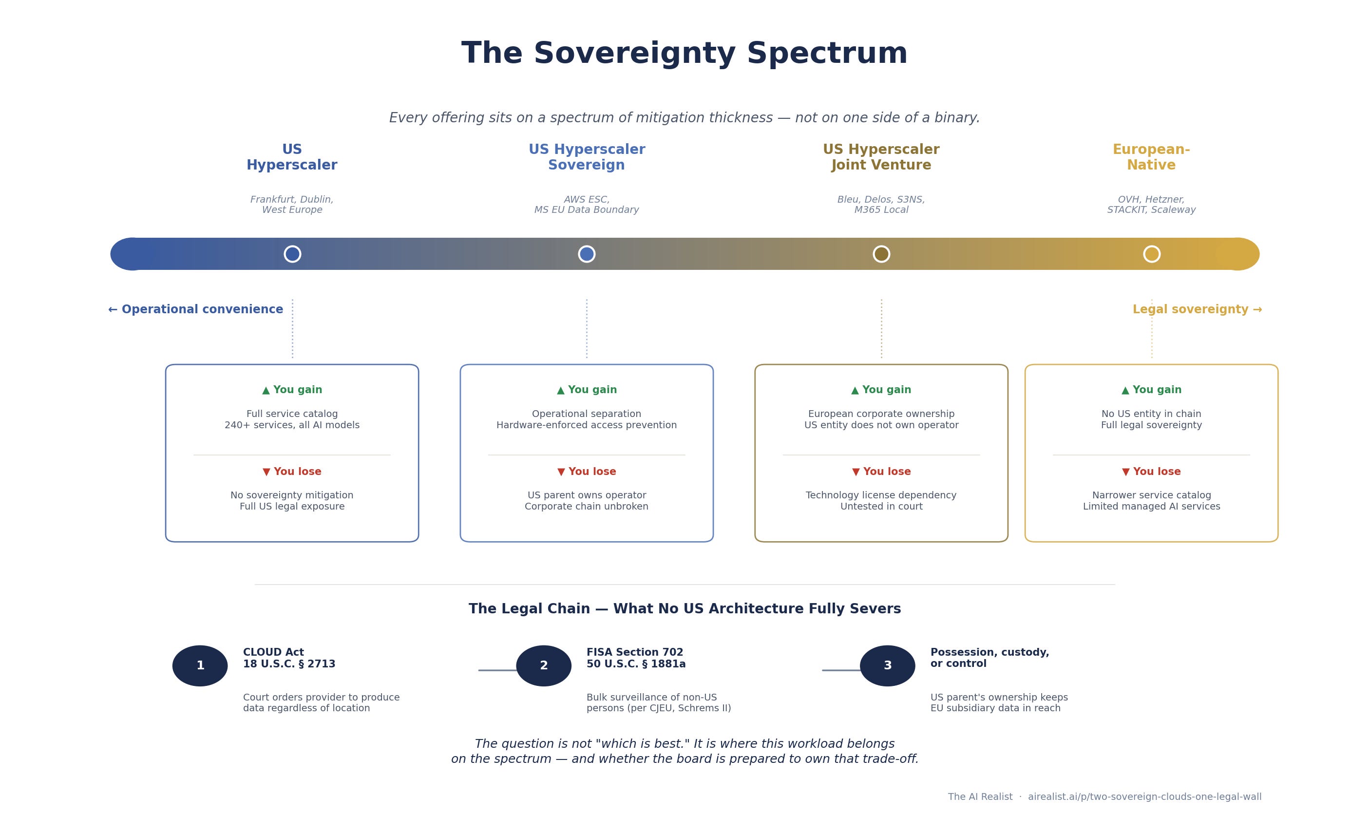 AWS and Microsoft have built different sovereign cloud architectures for Europe — a clean partition versus a layered governance model — and both represent serious engineering. But both architectures terminate at the same legal endpoint: a US parent company subject to the Clarifying Lawful Overseas Use of Data Act and the Foreign Intelligence Surveillance Act. Every sovereign offering from a US-headquartered provider sits somewhere on a spectrum of mitigation thickness, not on one side of a binary between sovereign and not. The CTO’s real job is not to choose “sovereign” or “not sovereign.” It is to match workload sensitivity to the right point on that spectrum — and to understand exactly which links in the legal exposure chain each architecture addresses, and which it does not.